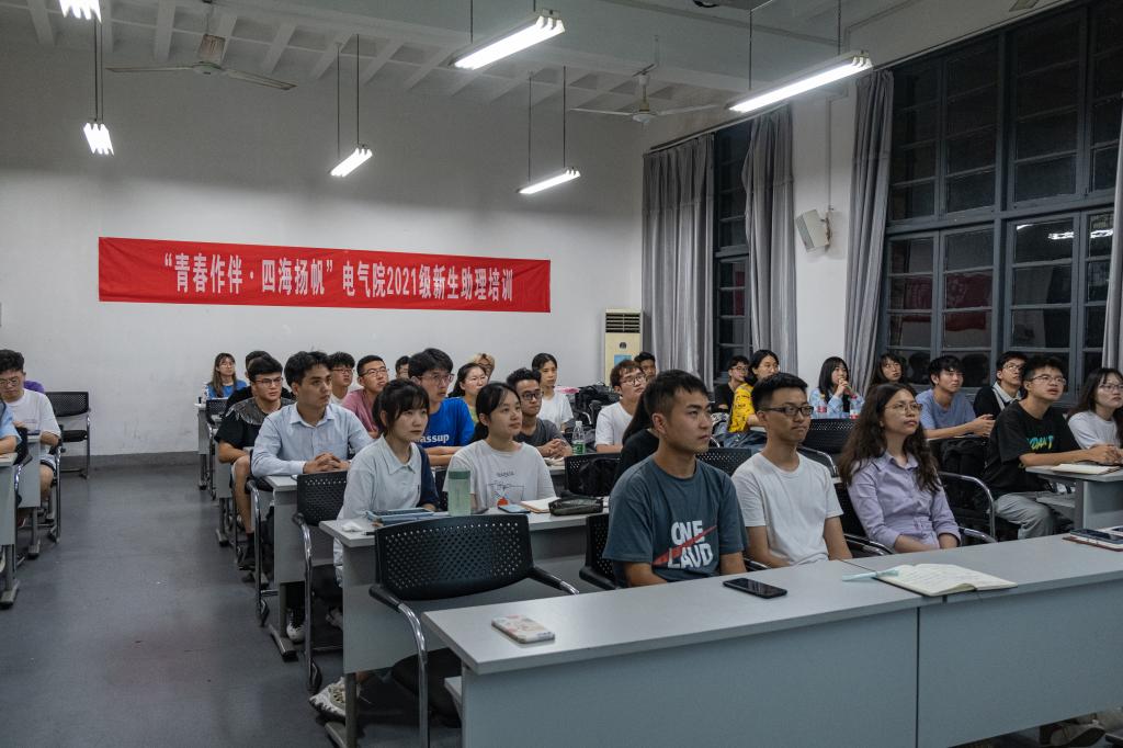 在培训小组展示阶段,新生助理上台汇报其小组在培训期间的组内分工、培训心得,展示了小组的迎新计划及带班理念。新生助理李可滢、黄春宇、杨昊天所在“迎春天”小组在展示中提到,新生们在电气院的沃土上扎根、成长时,新生助理就像是“园丁”,陪伴新生成长。
