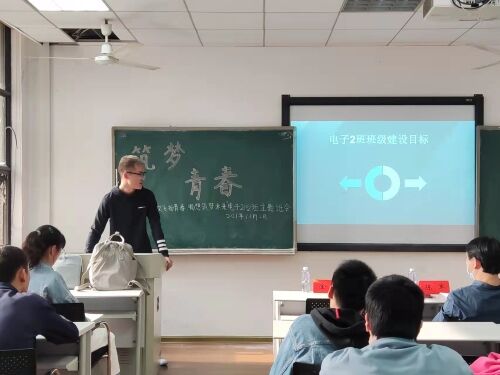 随后,班长崔炎同学分享了班级建设计划:电子2102班班级建设目标分为近期目标与长期目标。近期目标分为:1、建设全方面优秀班集体2、打造爱心班级3、向全校十佳班级体努力4、建设硬指标与班级特色相结合的“T”字型班集体。长期目标分为:1、学习资源共享2、班委发挥榜样3、规划人生方向。与此同时,崔炎同学进行了班级活动的预告。