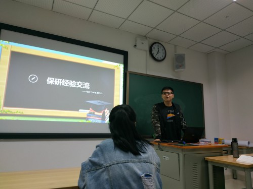 会议初始,由郭伟力同学进行经验分享。他从个人经历介绍、保研准备过程两个大的方面做了详细的解说。其中,在保研准备这一部分里,他重点向同学们讲解了学科竞赛、研究方向、学校导师选择这三个步骤。在介绍学科竞赛的时候,他告诉同学们,竞赛要有选择地去参加,不要盲目报名而浪费时间和精力。除此之外,他重点介绍了自己当年参与的一个科研项目,并鼓励同学们积极地去找老师做项目,提升个人能力。