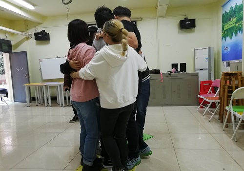 第三部分是游戏“集体搭桥”:将同学们分成三组,要求各小组成员全部站在坐垫上,脚的位置不能超出坐垫范围,然后通过移走坐垫的形式,“搭桥”移动。同学们紧紧地抱在一起,互相帮助着不让队友掉在地上,虽然外面下雨淅淅沥沥,但是屋里却格外暖和,大家合力完成任务,更加懂得团队的重要性。