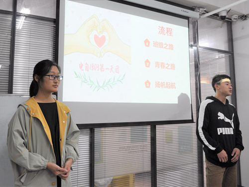 第一个板块是“班级之路,风雨同舟”。两位学生助理以17级星级班为例,从优班建设的重要性、具体指标、必要举措等方面向同学们发表了自己的看法,传授了相关经验。随后,每位同学都在分发的卡片上写下了自己对班级的期待与建议,并在分享环节踊跃发言。学习委员徐龙着重在学风建设方面进行分析。首先,他列出了即将来临的各种考试,加强同学们的危机感。其次,他将高中学习与大学学习做比较,倡导同学们心怀梦想、制定计划、坚持刷题、拒绝低头族。同时他提出,过段时间他会着手组织学霸讲堂、一对一帮扶小组、寝室学习小组等有利于学习的班级活动,督促同学们学习,带领大家共同进步。最后,班长王鑫宣布了班里新成立的四个小组,分别管理同学们的生活学习各个方面,帮助同学们筑梦青春,不再迷茫。