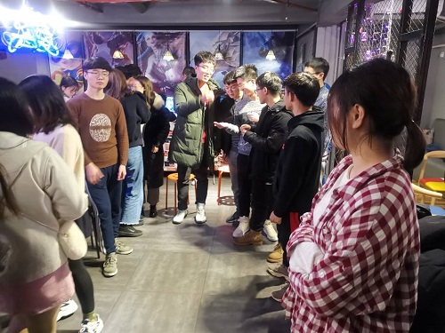 第二部分是游戏“你画我猜”:全班同学排成两列,每列的第一个同学通过肢体动作向下一个同学表演自己所看到的成语,后面的同学模仿前一个人的动作并传递下去,由最后一位同学猜出答案。游戏虽然简单,但体现出“失之毫厘,谬以千里”的道理,一点细微的差别足以影响最终的结果。在游戏过程中,大家都放松自我,卸下约束,为了团队的胜利尽力表演,尽管动作滑稽,倒也不失生趣,场面十分热闹。