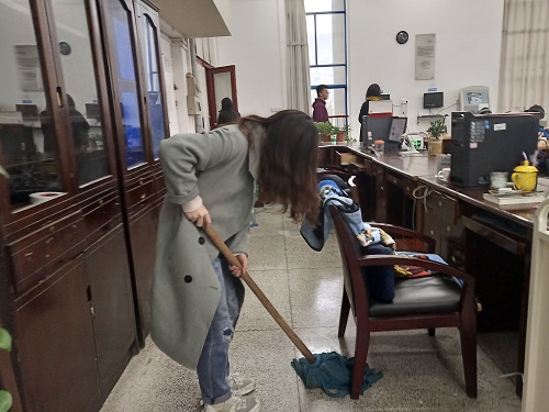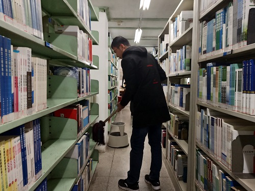 7楼的同学更是用汗水诠释着志愿服务精神的含义,他们一边用小托帕对书架的积尘进行清扫,又对所有地板一一擦拭。更让8班同学感动的是,自习的同学十分配合志愿者的清扫动作,主动让出位置帮助志愿者进行卫生管理。体现出当代大学生你中有我,我中有你的高尚品质。