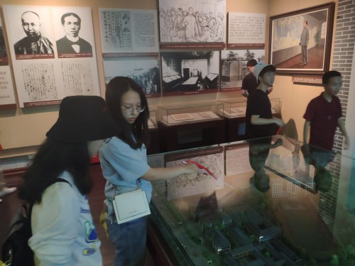 在第五展厅中,我们可以看到牌匾上“城南书院”四个大字,而第一师范的前身便是这样的一个古代书院,与岳麓书院齐名,共同享有“千年学府”的美誉。向里面再走上几步,便来到毛泽东曾经的教室门口,同学们不禁地想到这一代伟人的一生的贡献。1893年出生的他在青年时期便开始接触梁启超、康有为的改良主义思想,并且十分关注国家的政治局势。1911年,年仅18岁的他相应辛亥革命的号召,投笔从戎,毅然决然选择参兵。此后于1914年进入湖南省立第一师范学校学习。参观完各个展厅的种种历史遗迹,感受到近代中国浓厚的文化气息以及厚重的革命气息。来到大礼堂,一走进去,便是一种庄严安静的氛围,细细凝视礼堂后墙上的青年毛泽东演讲的油画,不免为那些青年的热血所感染,更为今日的和平生活而倍感珍惜。