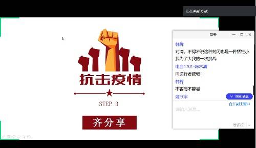会议第三项,“齐分享”。环节伊始,辅导员金晶从“制度优势、命运共同体、青春力量”三个关键词发表自己的感想。金老师还提到,部分同学在家中上网课,虽有困难亦在坚持,十分值得鼓励。另外,大三下学期之际,同学们在家中“停课不停学”的同时,也应着手思考未来,不负韶华、立志成才。紧接着,电自1701班班主任陈赦发言,他谈到“岁月静好”是每个人的共同期待,但如果每个人都只要自己的小确幸,又哪里会有我们每个人的美好生活呢?陈老师指出,美好生活总要有人去奉献和付出,没有大家,哪有小家。最后,班级预备党员陈木清也发表了自己感想。他提到,当代青年肩负着历史的使命和青年的责任,亦须有青年的担当和要求。他认为目前疫情还没有结束,防控的神经一刻也不能松懈。在分享交流期间,师生们在聊天区积极讨论,畅所欲言,气氛十分热闹。