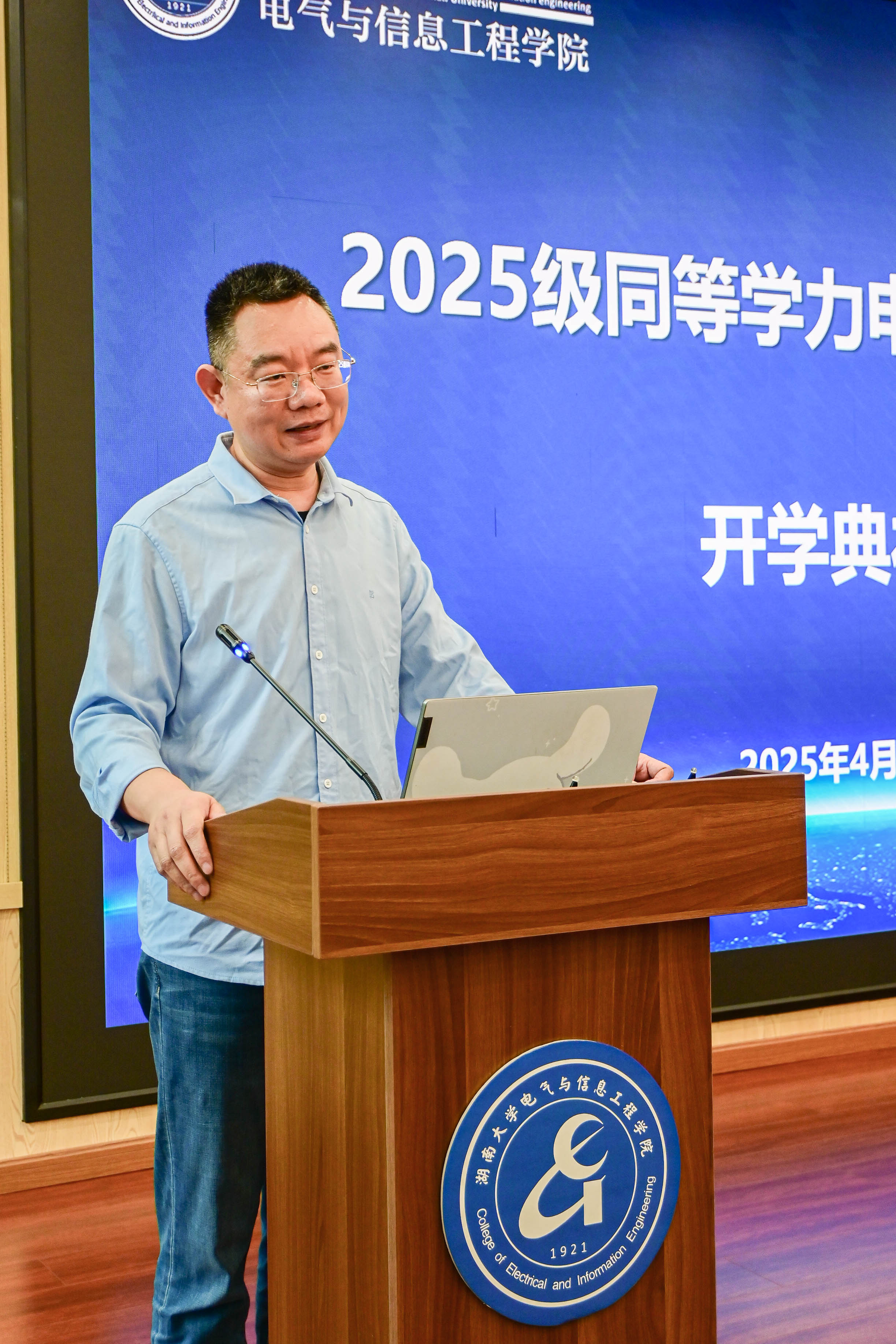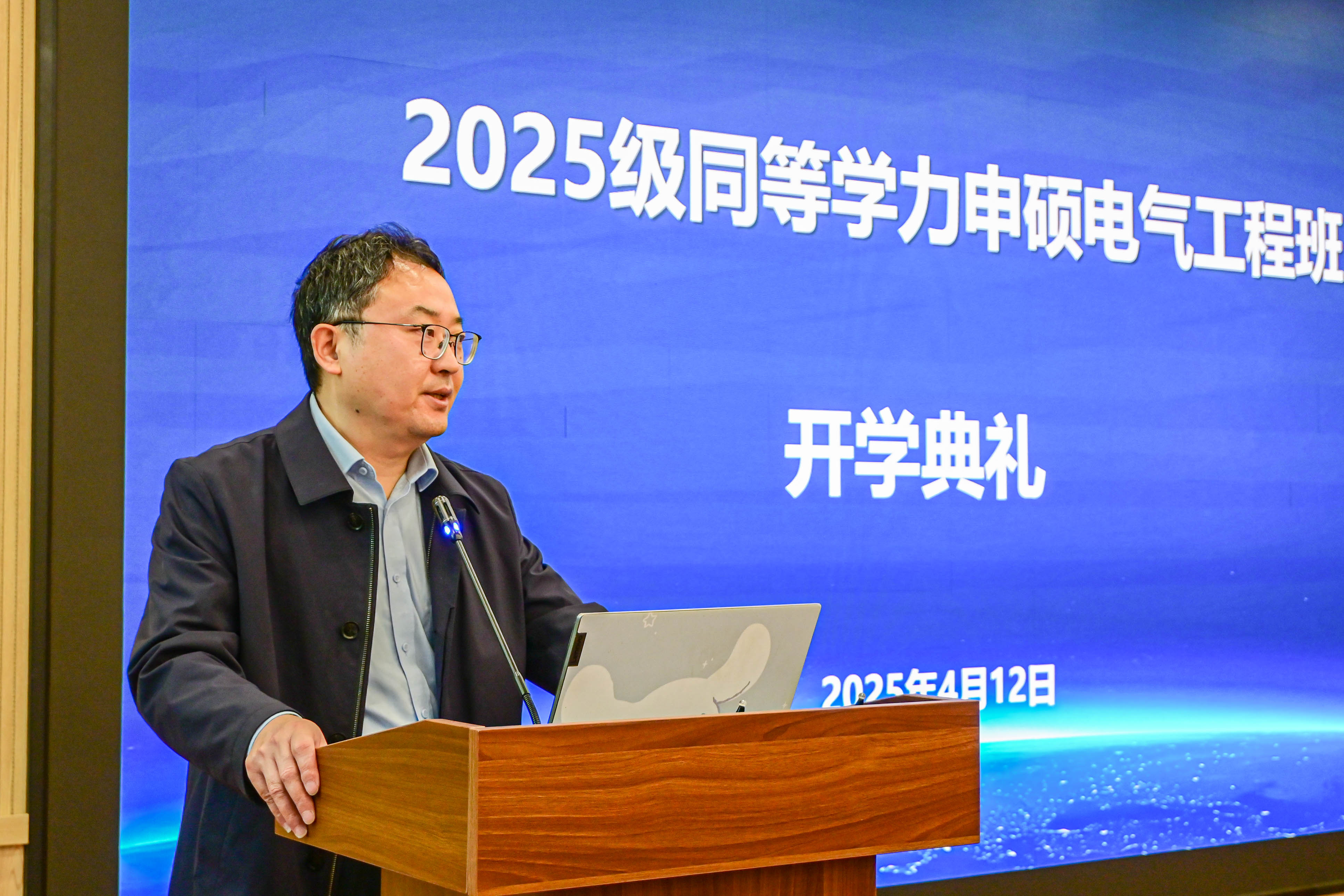 2025级同等学力申请硕士学位电气工程班开学典礼在院楼324报告厅隆重举行。典礼由副院长许加柱主持,学院党委书记张小刚、电气工程系主任荣飞等教师代表与53名新学员共同参与。
