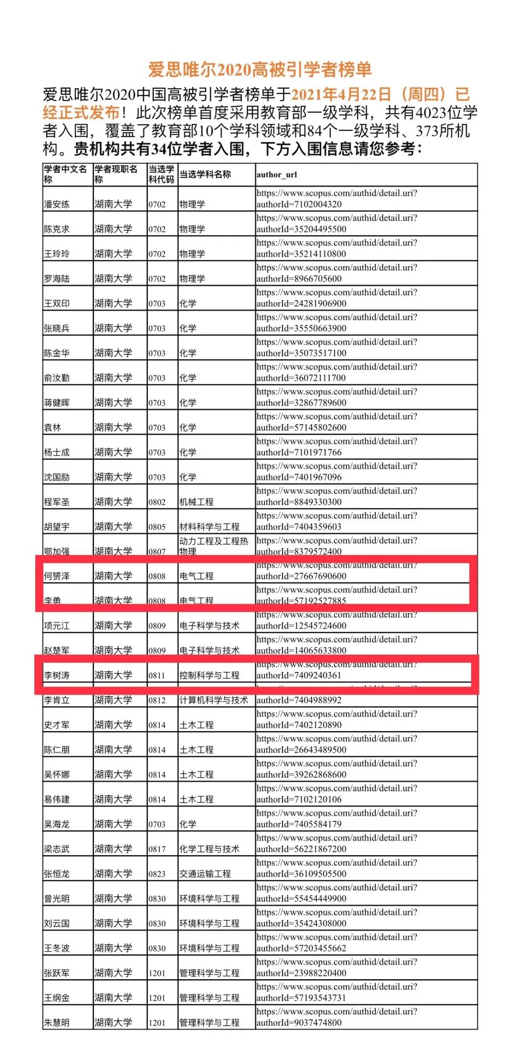 2021年4月22日,爱思唯尔2020中国高被引学者榜单正式发布!此次榜单首度采用教育部一级学科,共有4023位学者入围,覆盖了教育部10个学科领域和84个一级学科、373所机构。国产无码 共有34位学者入围,电气院的何赟泽老师、李勇老师、李树涛老师荣登此榜。特此报喜!
