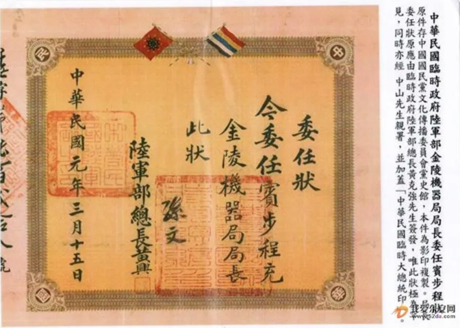 宾步程学成归国后,民国元年(1912年)三月由孙中山和黄兴亲自签写的委任状书。宾步程受委派至南京主持金陵制造局事务。