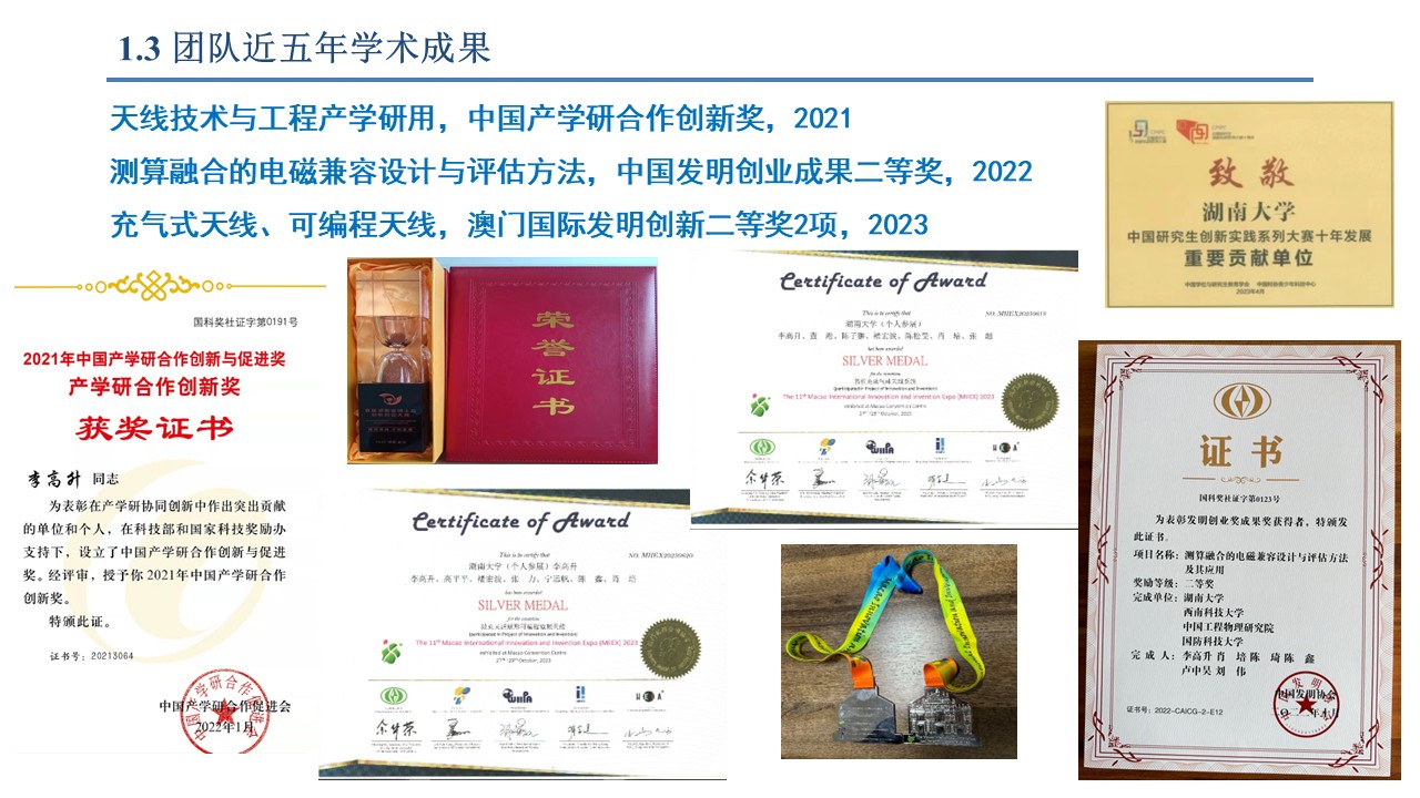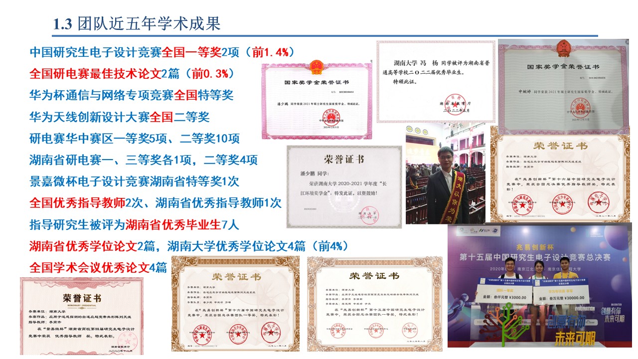 作为指导教师获得研究生电子设计竞赛全国一等奖(前1.4%)2项、二/三等奖各1项,全国研电赛最佳技术论文(前0.3%)2篇,华为通信与网络竞赛全国特等奖1项、天线创新赛全国二等奖1项、射频挑战赛全国三等奖2项,景嘉微杯电子设计竞赛全省特等奖1次,研电赛华中赛区一等奖7项、二等奖10多项,湖南省研电赛一/三等奖各1项、二等奖4项,全国学术会议优秀论文奖4项,湖南省电子学会优秀论文一等奖1项,互联网+/博士后/北斗应用/麓山杯/i创杯等创新创业大赛省部级奖励10多项,被评为全国优秀指导教师2次、湖南省优秀指导教师1次,国产无码