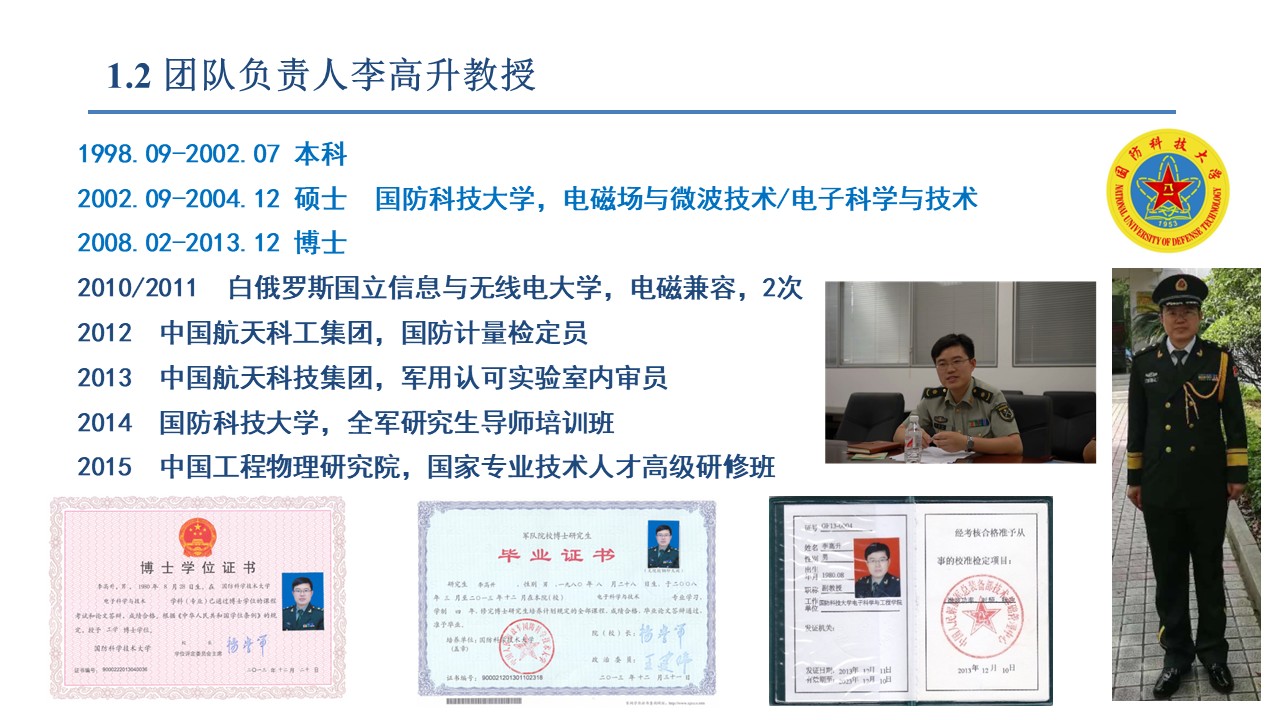IEEE Senior Member, 中国电子学会天线分会/中国电工技术学会电磁兼容专委会委员/中国兵工学会电磁专委会委员,中国通信/造船/仪器仪表学会高级会员,中国物理/汽车/宇航/电机学会会员,ACES/ISBE/IEICE Member,博士后(南航、无锡华测),国家公派访问学者(英国利物浦大学,University of Liverpool,2016-2017;白俄罗斯国立信息与无线电大学,2010-2011),教育部电子信息专业组专家、空军装备预研和采购评审专家,国家科技奖励评审/装备发展部专业组/科技委领域主题/工信部/科技部专家库成员,湖南/山东/江苏/浙江/江西/广西/深圳等省/区/市科技咨询评审专家,中国教育技术协会教育仿真分会/全国高校电磁场教学与教材研究会/湖南省电子学会常务理事,天隼实验室/电磁信息控制与效应全国重点实验室/电磁环境效应一带一路国际联合实验室客座教授,山西省电磁防护重点实验室/中国兵器工业集团微波电磁重点实验室学术委员会委员,新疆自治区天池英才特聘专家,湖南省科技创新领军人才。