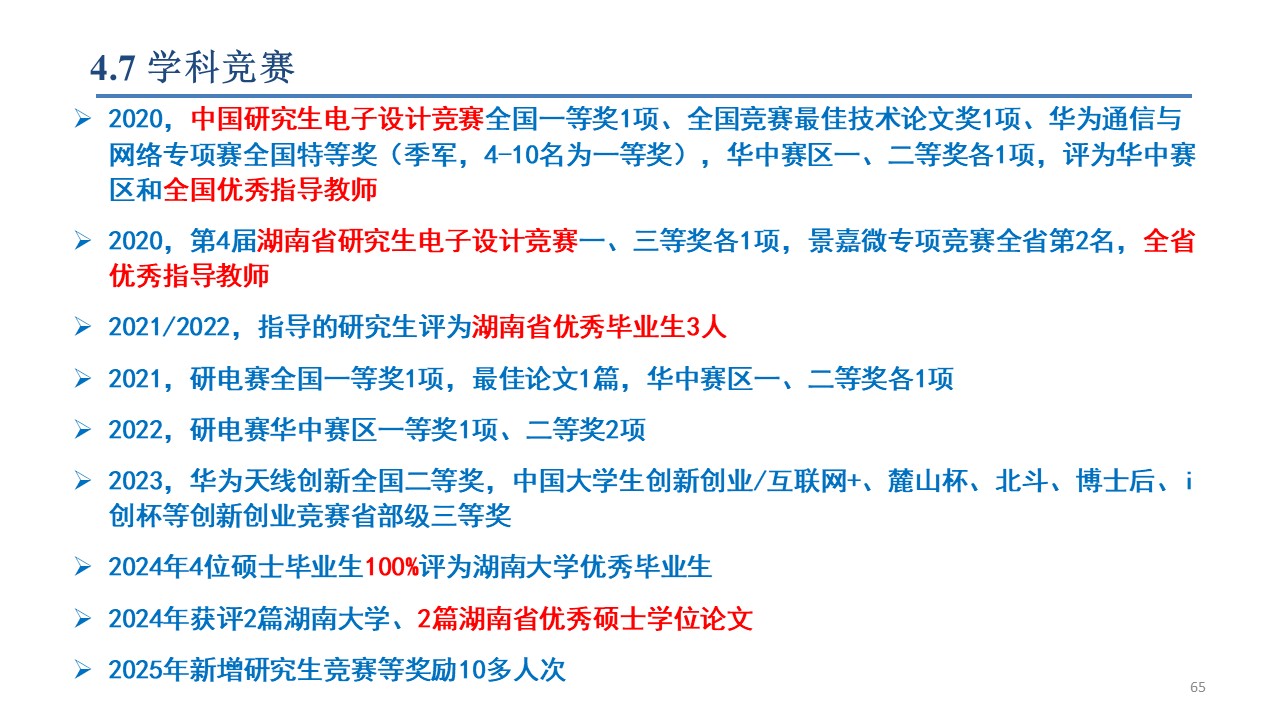 作为指导教师获得研究生电子设计竞赛全国一等奖(前1.4%)2项、二/三等奖各1项,全国研电赛最佳技术论文(前0.3%)2篇,华为通信与网络竞赛全国特等奖1项、天线创新赛全国二等奖1项、射频挑战赛全国三等奖2项,景嘉微杯电子设计竞赛全省特等奖1次,研电赛华中赛区一等奖7项、二等奖10多项,湖南省研电赛一/三等奖各1项、二等奖4项,全国学术会议优秀论文奖4项,湖南省电子学会优秀论文一等奖1项,互联网+/博士后/北斗应用/麓山杯/i创杯等创新创业大赛省部级奖励10多项,被评为全国优秀指导教师2次、湖南省优秀指导教师1次,国产无码